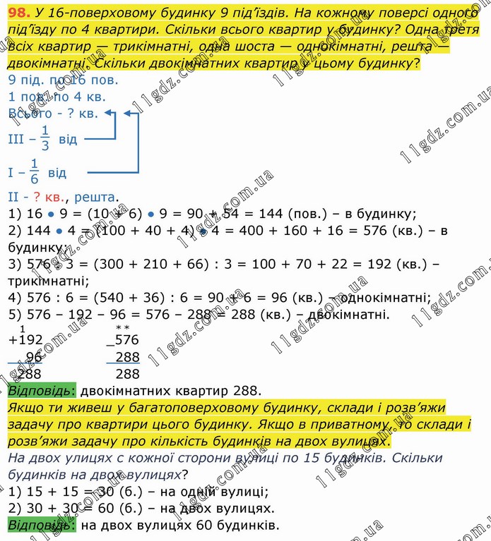 У 16-поверховому будинку 9 під’їздів. На кожному поверсі одного під’їзду по 4 квартири. Скільки всього квартир у будинку? Одна третя всіх квартир — трикімнатні, одна шоста — однокімнатні, решта — двокімнатні. Скільки двокімнатних квартир у цьому будинку? 9 під. по 16 пов. 1 пов. по 4 кв. Всього - ? кв. ІІІ – 13 від І – 16 від ІІ - ? кв., решта. 1) 16 ● 9 = (10 + 6) ● 9 = 90 + 54 = 144 (пов.) – в будинку; 2) 144 ● 4 = (100 + 40 + 4) ● 4 = 400 + 160 + 16 = 576 (кв.) – в будинку; 3) 576 : 3 = (300 + 210 + 66) : 3 = 100 + 70 + 22 = 192 (кв.) – трикімнатні; 4) 576 : 6 = (540 + 36) : 6 = 90 + 6 = 96 (кв.) – однокімнатні; 5) 576 – 192 – 96 = 576 – 288 = 288 (кв.) – двокімнатні. +1(1)92 96 288 _5(*)7(*)6 288 288 Відповідь: двокімнатних квартир 288. Якщо ти живеш у багатоповерховому будинку, склади і розв’яжи задачу про квартири цього будинку. Якщо в приватному, то склади і розв’яжи задачу про кількість будинків на двох вулицях. На двох улицях с кожної сторони вулиці по 15 будинків. Скільки будинків на двох вулицях? 1) 15 + 15 = 30 (б.) – на одній вулиці; 2) 30 + 30 = 60 (б.) – на двох вулицях. Відповідь: на двох вулицях 60 будинків.