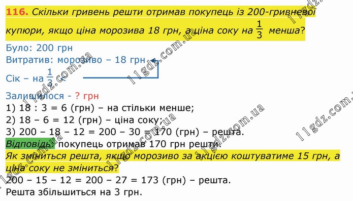 Скільки гривень решти отримав покупець із 200-гривневої купюри, якщо ціна морозива 18 грн, а ціна соку на 13 менша? Було: 200 грн Витратив: морозиво – 18 грн Сік – на 13 < Залишилося - ? грн 1) 18 : 3 = 6 (грн) – на стільки менше; 2) 18 – 6 = 12 (грн) – ціна соку; 3) 200 – 18 – 12 = 200 – 30 = 170 (грн) – решта. Відповідь: покупець отримав 170 грн решти. Як зміниться решта, якщо морозиво за акцією коштуватиме 15 грн, а ціна соку не зміниться? 200 – 15 – 12 = 200 – 27 = 173 (грн) – решта. Решта збільшиться на 3 грн.