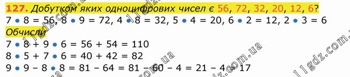 Добутком яких одноцифрових чисел є 56, 72, 32, 20, 12, 6? 7 ● 8 = 56, 8 ● 9 = 72, 4 ● 8 = 32, 5 ● 4 = 20, 6 ● 2 = 12, 2 ● 3 = 6 Обчисли 7 ● 8 + 9 ● 6 = 56 + 54 = 110 8 ● 5 + 7 ● 6 = 40 + 42 = 82 9 ● 9 – 8 ● 8 = 81 – 64 = 81 – 60 – 4 = 21 – 4 = 17