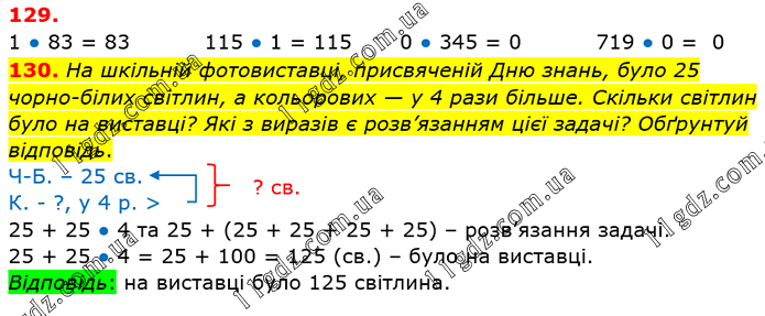1 ● 83 = 83 115 ● 1 = 115 0 ● 345 = 0 719 ● 0 = 130. На шкільній фотовиставці, присвяченій Дню знань, було 25 чорно-білих світлин, а кольорових — у 4 рази більше. Скільки світлин було на виставці? Які з виразів є розв’язанням цієї задачі? Обґрунтуй відповідь. Ч-Б. – 25 св. К. - ?, у 4 р. > 25 + 25 ● 4 та 25 + (25 + 25 + 25 + 25) – розв’язання задачі. 25 + (20 + 5) ● 4 = 25 + 80 + 20 = 25 + 100 = 125 (св.) – було на виставці. Відповідь: на виставці було 125 світлина.