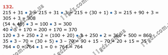 215 + 31 ● 3 = 215 + 31 ● 3 = 215 + (30 + 1) ● 3 = 215 + 90 + 3 = 305 + 3 = 308 (54 + 46) ● 3 = 100 ● 3 = 300 40 ● 5 + 170 = 200 + 170 = 370 120 ● 3 + 250 ● 2 = (100 + 20) ● 3 + 250 ● 2 = 360 + 500 = 860 35 ● 3 – 70 = (30 + 5) ● 3 – 70 = 90 + 15 – 70 = 20 + 15 = 35 764 ● 0 + 764 ● 1 = 0 + 764 = 764