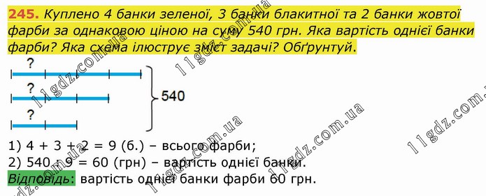 Куплено 4 банки зеленої, 3 банки блакитної та 2 банки жовтої фарби за однаковою ціною на суму 540 грн. Яка вартість однієї банки фарби? Яка схема ілюструє зміст задачі? Обґрунтуй. 1) 4 + 3 + 2 = 9 (б.) – всього фарби; 2) 540 : 9 = 60 (грн) – вартість однієї банки. Відповідь: вартість однієї банки фарби 60 грн.
