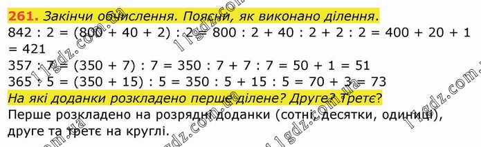 Закінчи обчислення. Поясни, як виконано ділення. 842 : 2 = (800 + 40 + 2) : 2 = 800 : 2 + 40 : 2 + 2 : 2 = 400 + 20 + 1 = 421 357 : 7 = (350 + 7) : 7 = 350 : 7 + 7 : 7 = 50 + 1 = 51 365 : 5 = (350 + 15) : 5 = 350 : 5 + 15 : 5 = 70 + 3 = 73 На які доданки розкладено перше діленe? Друге? Третє? Перше розкладено на розрядні доданки (сотні, десятки, одиниці), друге та третє на круглі.