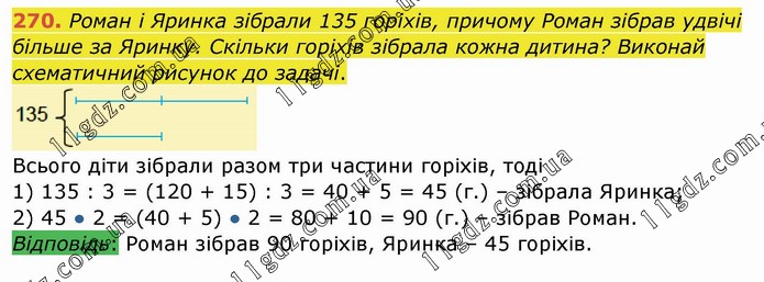 Роман і Яринка зібрали 135 горіхів, причому Роман зібрав удвічі більше за Яринку. Скільки горіхів зібрала кожна дитина? Виконай схематичний рисунок до задачі. Всього діти зібрали разом три частини горіхів, тоді 1) 135 : 3 = (120 + 15) : 3 = 40 + 5 = 45 (г.) – зібрала Яринка; 2) 45 ● 2 = (40 + 5) ● 2 = 80 + 10 = 90 (г.) – зібрав Роман. Відповідь: Роман зібрав 90 горіхів, Яринка – 45 горіхів.