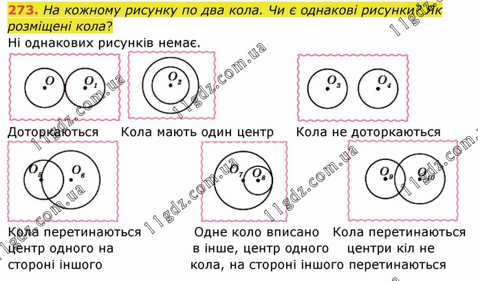 На кожному рисунку по два кола. Чи є однакові рисунки? Як розміщені кола? Ні однакових рисунків немає. Доторкаються Кола мають один центр Кола не доторкаються Кола перетинаються Одне коло вписано Кола перетинаються центр одного на в інше, центр одного центри кіл не стороні іншого кола, на стороні іншого перетинаються
