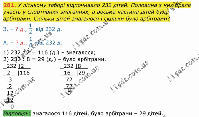 У літньому таборі відпочивало 232 дітей. Половина з них брала участь у спортивних змаганнях, а восьма частина дітей була арбітрами. Скільки дітей змагалося і скільки було арбітрами? З. – ? д., 12 від 232 д. А. – ? д., 18 від 232 д. 1) 232 : 2 = 116 (д.) – змагалося; 2) 232 : 8 = 29 (д.) – було арбітрами. _232 |2__ 2 |116 3 2 12 12 0 _232 |8__ 16 |29 72 72 0 Відповідь: змагалося 116 дітей, було арбітрами – 29 дітей.