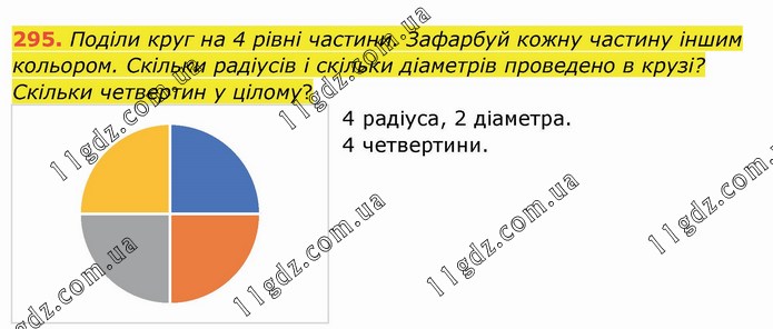 Поділи круг на 4 рівні частини. Зафарбуй кожну частину іншим кольором. Скільки радіусів і скільки діаметрів проведено в крузі? Скільки четвертин у цілому? 4 радіуса, 2 діаметра. 4 четвертини.