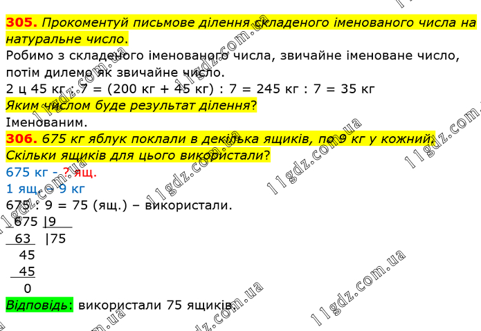 Прокоментуй письмове ділення складеного іменованого числа на натуральне число. Робимо з складеного іменованого числа, звичайне іменоване число, потім дилемо як звичайне число. 2 ц 45 кг : 7 = (200 кг + 45 кг) : 7 = 245 кг : 7 = 35 кг Яким числом буде результат ділення? Іменованим. 306. 675 кг яблук поклали в декілька ящиків, по 9 кг у кожний. Скільки ящиків для цього використали? 675 кг - ? ящ. 1 ящ. – 9 кг 675 : 9 = 75 (ящ.) – використали. Відповідь: використали 75 ящиків.