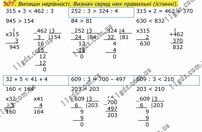 Випиши нерівності. Визнач серед них правильні (істинні). 315 ● 3 < 462 : 3 252 : 3 > 324 : 4 315 ● 2 = 462 + 370 945 > 154 84 > 81 630 < 832 х31(1)5 3 945 _462 |3__ 3 |154 16 15_ 12 12 0 _252 |3__ 24 |84 12 12 0 _324 |4__ 32 |81 4 4 0 х315 2 630 +4(1)62 370 832 32 ● 5 < 41 ● 4 609 : 3 = 700 – 497 609 : 3 < 210 160 < 164 203 = 203 203 < 210 х32 5 160 х41 4 164 _609 |3__ 6 |203 9 9 0 _7(*)0(*)0 497 203 _609 |3__ 6 |203 9 9 0