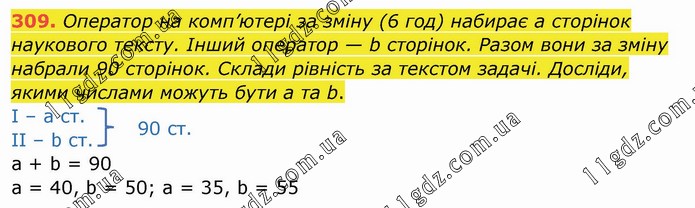 Оператор на комп’ютері за зміну (6 год) набирає a сторінок наукового тексту. Інший оператор — b сторінок. Разом вони за зміну набрали 90 сторінок. Склади рівність за текстом задачі. Досліди, якими числами можуть бути a та b. І – а ст. ІІ – b ст. a + b = 90 a = 40, b = 50; a = 35, b = 55