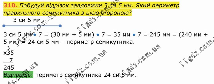 Побудуй відрізок завдовжки 3 см 5 мм. Який периметр правильного семикутника з цією стороною? 3 см 5 мм 3 см 5 мм ● 7 = (30 мм + 5 мм) ● 7 = 35 мм ● 7 = 245 мм = (240 мм + 5 мм) = 24 см 5 мм – периметр семикутника. х3(3)5 7 245 Відповідь: периметр семикутника 24 см 5 мм.