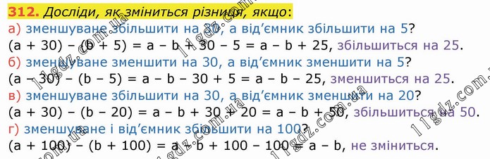 Досліди, як зміниться різниця, якщо: а) зменшуване збільшити на 30, а від’ємник збільшити на 5? (a + 30) – (b + 5) = a – b + 30 – 5 = a – b + 25, збільшиться на 25. б) зменшуване зменшити на 30, а від’ємник зменшити на 5? (a – 30) – (b – 5) = a – b – 30 + 5 = a – b – 25, зменшиться на 25. в) зменшуване збільшити на 30, а від’ємник зменшити на 20? (a + 30) – (b – 20) = a – b + 30 + 20 = a – b + 50, збільшиться на 50. г) зменшуване і від’ємник збільшити на 100? (a + 100) – (b + 100) = a – b + 100 – 100 = a – b, не зміниться.