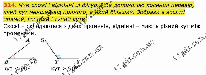 Чим схожі і відмінні ці фігури? За допомогою косинця перевір, який кут менший від прямого, а який більший. Зобрази в зошиті прямий, гострий і тупий кути. Схожі – складаються з двох променів, відмінні – мають різний кут між променями. кут < 90O кут > 90О