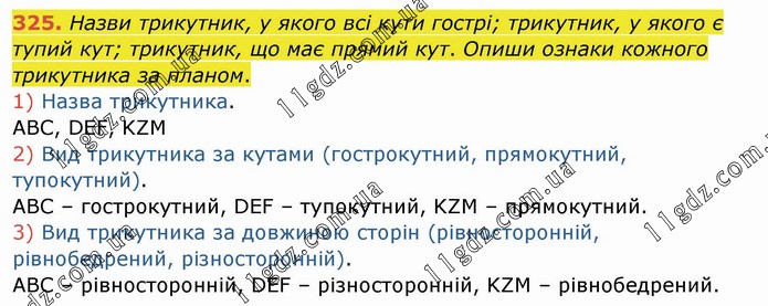 Назви трикутник, у якого всі кути гострі; трикутник, у якого є тупий кут; трикутник, що має прямий кут. Опиши ознаки кожного трикутника за планом. 1) Назва трикутника. АВС, DEF, KZM 2) Вид трикутника за кутами (гострокутний, прямокутний, тупокутний). АВС – гострокутний, DEF – тупокутний, KZM – прямокутний. 3) Вид трикутника за довжиною сторін (рівносторонній, рівнобедрений, різносторонній). АВС – рівносторонній, DEF – різносторонній, KZM – рівнобедрений.