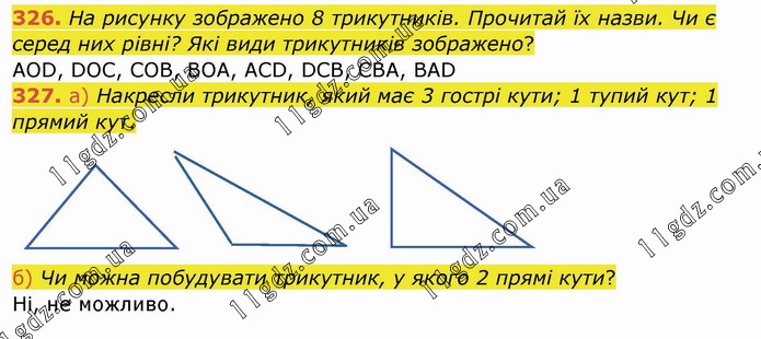 На рисунку зображено 8 трикутників. Прочитай їх назви. Чи є серед них рівні? Які види трикутників зображено? AOD, DOC, COB, BOA, ACD, DCB, CBA, BAD 327. а) Накресли трикутник, який має 3 гострі кути; 1 тупий кут; 1 прямий кут. б) Чи можна побудувати трикутник, у якого 2 прямі кути? Ні, не можливо.