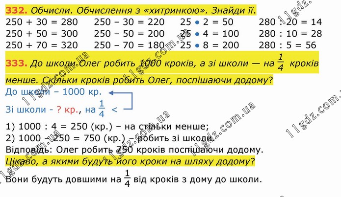 Обчисли. Обчислення з «хитринкою». Знайди її. 250 + 30 = 280 250 + 50 = 300 250 + 70 = 320 250 – 30 = 220 250 – 50 = 200 250 – 70 = 180 25 ● 2 = 50 25 ● 4 = 100 25 ● 8 = 200 280 : 20 = 14 280 : 10 = 28 280 : 5 = 56 333. До школи Олег робить 1000 кроків, а зі школи — на 14 кроків менше. Скільки кроків робить Олег, поспішаючи додому? До школи – 1000 кр. Зі школи - ? кр., на 14 < 1) 1000 : 4 = 250 (кр.) – на стільки менше; 2) 1000 – 250 = 750 (кр.) – робить зі школи. Відповідь: Олег робить 750 кроків поспішаючи додому. Цікаво, а якими будуть його кроки на шляху додому? Вони будуть довшими на 14 від кроків з дому до школи.