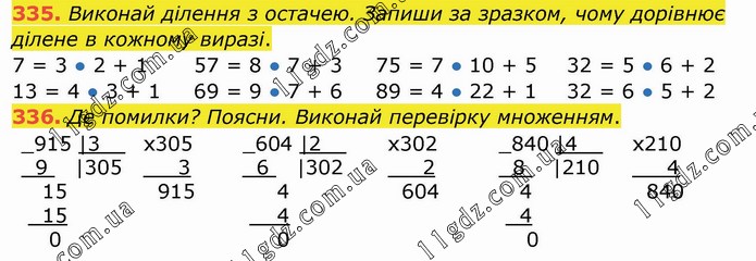 Виконай ділення з остачею. Запиши за зразком, чому дорівнює ділене в кожному виразі. 7 = 3 ● 2 + 1 13 = 4 ● 3 + 1 57 = 8 ● 7 + 3 69 = 9 ● 7 + 6 75 = 7 ● 10 + 5 89 = 4 ● 22 + 1 32 = 5 ● 6 + 2 32 = 6 ● 5 + 2 336. Де помилки? Поясни. Виконай перевірку множенням.