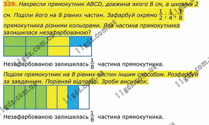Накресли прямокутник АВСD, довжина якого 8 см, а ширина 2 см. Поділи його на 8 рівних частин. Зафарбуй окремо 12 ; 14 ; 18 прямокутника різними кольорами. Яка частина прямокутника залишилася незафарбованою? Незафарбованою залишилась 18 частина прямокутника. Поділи прямокутник на 8 рівних частин іншим способом. Розфарбуй за завданням. Порівняй відповіді. Зроби висновок. Незафарбованою залишилась 18 частина прямокутника.