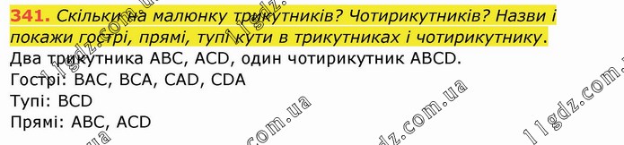 Скільки на малюнку трикутників? Чотирикутників? Назви і покажи гострі, прямі, тупі кути в трикутниках і чотирикутнику. Два трикутника АВС, АСD, один чотирикутник ABCD. Гострі: ВАС, ВСА, САD, CDA Тупі: BCD Прямі: ABC, ACD