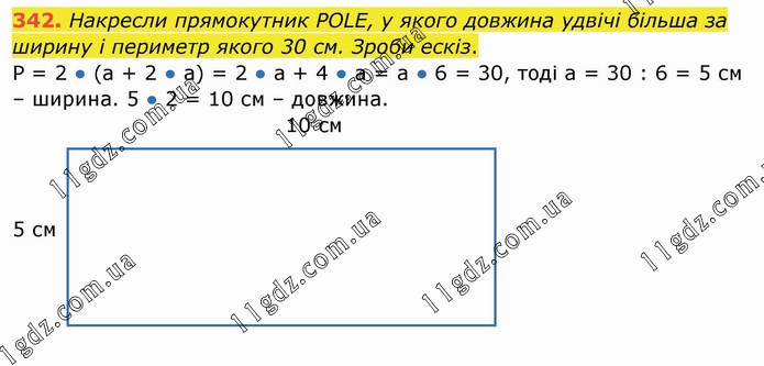 Накресли прямокутник POLE, у якого довжина удвічі більша за ширину і периметр якого 30 см. Зроби ескіз. Р = 2 ● (а + 2 ● а) = 2 ● а + 4 ● а = а ● 6 = 30, тоді а = 30 : 6 = 5 см – ширина. 5 ● 2 = 10 см – довжина.