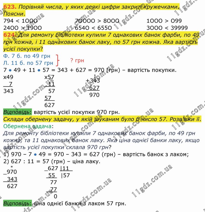 Порівняй числа, у яких деякі цифри закриті кружечками. Поясни. 794 < 1OOO 24OO > 19OO 7OOOO > 8OOO 654O < 655O 1OOO > O99 3OOO < 39999 624. Для ремонту бібліотеки купили 7 однакових банок фарби, по 49 грн кожна, і 11 однакових банок лаку, по 57 грн кожна. Яка вартість усієї покупки? Ф. 7 б. по 49 грн Л. 11 б. по 57 грн 7 ● 49 + 11 ● 57 = 343 + 627 = 970 (грн) – вартість покупки. Склади обернену задачу, у якій шуканим було б число 57. Розв’яжи її. Обернена задача: Для ремонту бібліотеки купили 7 однакових банок фарби, по 49 грн кожна, та 11 однакових банок лаку. Яка ціна однієї банки лаку, якщо вартість усієї покупки склала 970 грн? 1) 970 – 7 ● 49 = 970 – 343 = 627 (грн) – вартість банок з лаком; 2) 627 : 11 = 57 (грн) – ціна лаку.