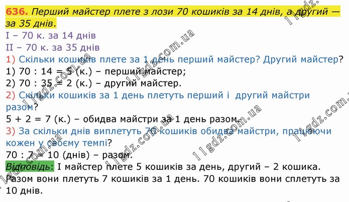 Перший майстер плете з лози 70 кошиків за 14 днів, а другий — за 35 днів. І – 70 к. за 14 днів ІІ – 70 к. за 35 днів 1) Скільки кошиків плете за 1 день перший майстер? Другий майстер? 1) 70 : 14 = 5 (к.) – перший майстер; 2) 70 : 35 = 2 (к.) – другий майстер. 2) Скільки кошиків за 1 день плетуть перший і другий майстри разом? 5 + 2 = 7 (к.) – обидва майстри за 1 день разом. 3) За скільки днів виплетуть 70 кошиків обидва майстри, працюючи кожен у своєму темпі? 70 : 7 = 10 (днів) – разом. Відповідь: І майстер плете 5 кошиків за день, другий – 2 кошика. Разом вони плетуть 7 кошиків за 1 день. 70 кошиків вони сплетуть за 10 днів.
