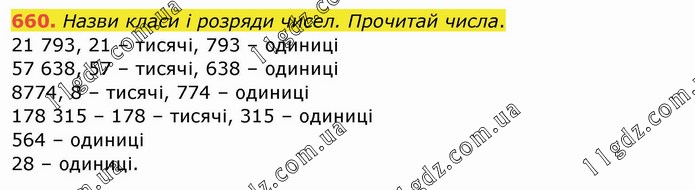 Назви класи і розряди чисел. Прочитай числа. 21 793, 21 – тисячі, 793 – одиниці 57 638, 57 – тисячі, 638 – одиниці 8774, 8 – тисячі, 774 – одиниці 178 315 – 178 – тисячі, 315 – одиниці 564 – одиниці 28 – одиниці.