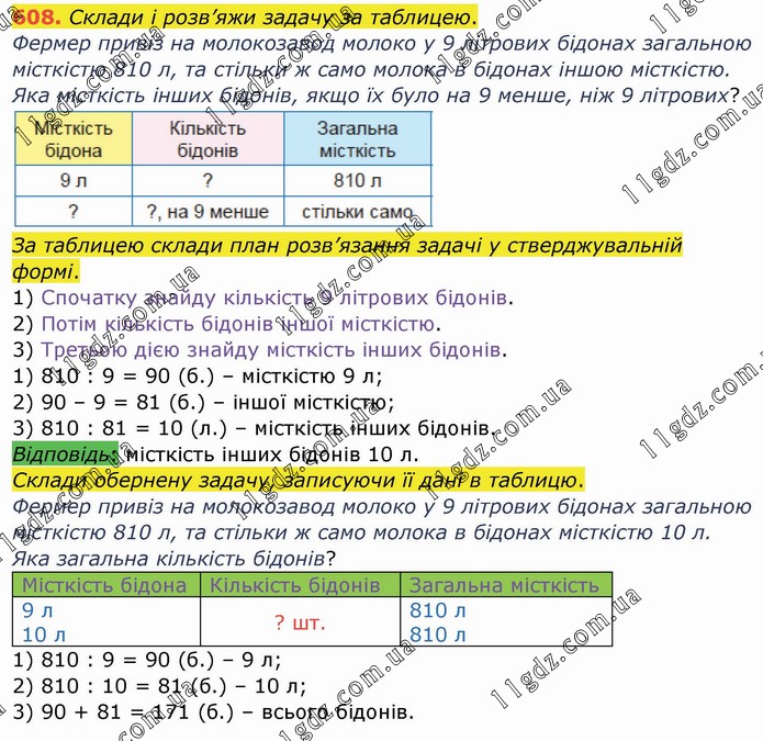 Склади і розв’яжи задачу за таблицею. Фермер привіз на молокозавод молоко у 9 літрових бідонах загальною місткістю 810 л, та стільки ж само молока в бідонах іншою місткістю. Яка місткість інших бідонів, якщо їх було на 9 менше, ніж 9 літрових? За таблицею склади план розв’язання задачі у стверджувальній формі. 1) Спочатку знайду кількість 9 літрових бідонів. 2) Потім кількість бідонів іншої місткістю. 3) Третьою дією знайду місткість інших бідонів. 1) 810 : 9 = 90 (б.) – місткістю 9 л; 2) 90 – 9 = 81 (б.) – іншої місткістю; 3) 810 : 81 = 10 (л.) – місткість інших бідонів. Відповідь: місткість інших бідонів 10 л. Склади обернену задачу, записуючи її дані в таблицю. Фермер привіз на молокозавод молоко у 9 літрових бідонах загальною місткістю 810 л, та стільки ж само молока в бідонах місткістю 10 л. Яка загальна кількість бідонів? Місткість бідона Кількість бідонів Загальна місткість 9 л 10 л ? шт. 810 л 810 л 1) 810 : 9 = 90 (б.) – 9 л; 2) 810 : 10 = 81 (б.) – 10 л; 3) 90 + 81 = 171 (б.) – всього бідонів.