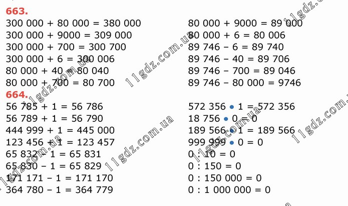 300 000 + 80 000 = 380 000 300 000 + 9000 = 309 000 300 000 + 700 = 300 700 300 000 + 6 = 300 006 80 000 + 40 = 80 040 80 000 + 700 = 80 700 80 000 + 9000 = 89 000 80 000 + 6 = 80 006 89 746 – 6 = 89 740 89 746 – 40 = 89 706 89 746 – 700 = 89 046 89 746 – 80 000 = 9746 664. 56 785 + 1 = 56 786 56 789 + 1 = 56 790 444 999 + 1 = 445 000 123 456 + 1 = 123 457 65 832 – 1 = 65 831 65 830 – 1 = 65 829 171 171 – 1 = 171 170 364 780 – 1 = 364 779 572 356 ● 1 = 572 356 18 756 ● 0 = 0 189 566 ● 1 = 189 566 999 999 ● 0 = 0 0 : 10 = 0 0 : 150 = 0 0 : 150 000 = 0 0 : 1 000 000 = 0