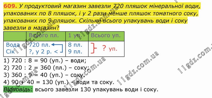 У продуктовий магазин завезли 720 пляшок мінеральної води, упакованих по 8 пляшок, і у 2 рази менше пляшок томатного соку, упакованих по 9 пляшок. Скільки всього упакувань води і соку завезли в магазин? Всього пл. 1 уп. Всього уп. Вода Сік 720 пл. ?, у 2 р. < 8 пл. 9 пл. 1) 720 : 8 = 90 (уп.) – води; 2) 720 : 2 = 360 (пл.) – соку; 3) 360 : 9 = 40 (уп.) – соку. 4) 90 + 40 = 130 (уп.) – води та соку. Відповідь: всього завезли 130 упакувань води і соку.