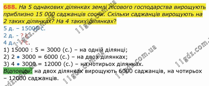 На 5 однакових ділянках землі лісового господарства вирощують приблизно 15 000 саджанців сосни. Скільки саджанців вирощують на 2 таких ділянках? На 4 таких ділянках? 5 д. – 15000 с. 2 д. - ? с. 4 д. - ? с. 1) 15000 : 5 = 3000 (с.) – на одній ділянці; 2) 2 ● 3000 = 6000 (с.) – на двох ділянках; 3) 4 ● 3000 = 12000 (с.) – на чотирьох ділянках. Відповідь: на двох ділянках вирощують 6000 саджанців, на чотирьох – 12000 саджанців.