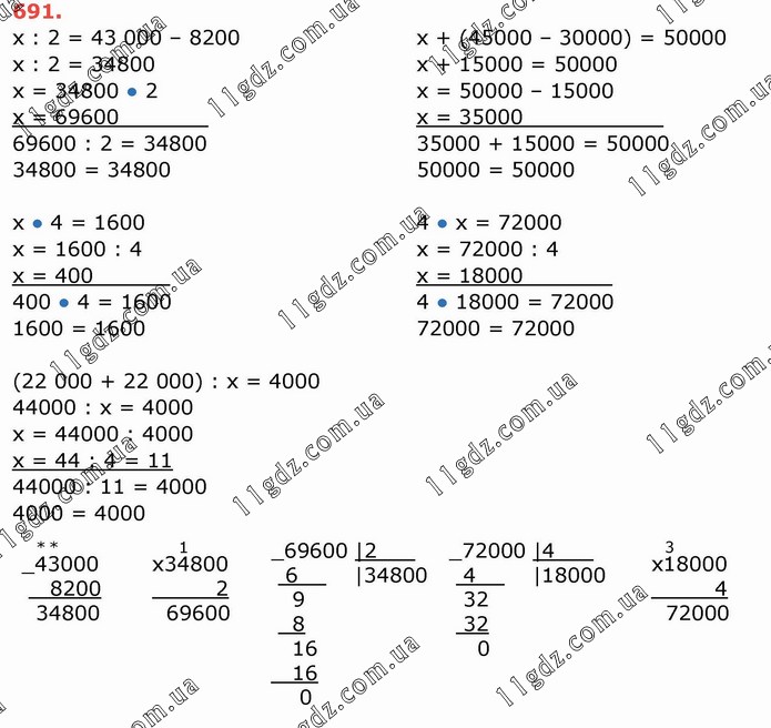 x : 2 = 43 000 – 8200 х : 2 = 34800 х = 34800 ● 2 х = 69600_______ 69600 : 2 = 34800 34800 = 34800 x + (45000 – 30000) = 50000 х + 15000 = 50000 х = 50000 – 15000 х = 35000___________ 35000 + 15000 = 50000 50000 = 50000 х ● 4 = 1600 х = 1600 : 4 х = 400______ 400 ● 4 = 1600 1600 = 1600 4 ● х = 72000 х = 72000 : 4 х = 18000_______ 4 ● 18000 = 72000 72000 = 72000 (22 000 + 22 000) : x = 4000 44000 : х = 4000 х = 44000 : 4000 х = 44 : 4 = 11 44000 : 11 = 4000 4000 = 4000