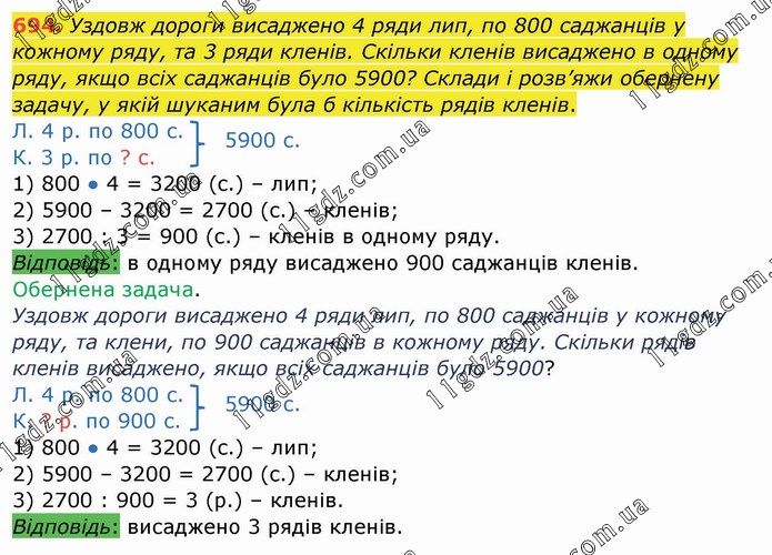 Уздовж дороги висаджено 4 ряди лип, по 800 саджанців у кожному ряду, та 3 ряди кленів. Скільки кленів висаджено в одному ряду, якщо всіх саджанців було 5900? Склади і розв’яжи обернену задачу, у якій шуканим була б кількість рядів кленів. Л. 4 р. по 800 с. К. 3 р. по ? с. 1) 800 ● 4 = 3200 (с.) – лип; 2) 5900 – 3200 = 2700 (с.) – кленів; 3) 2700 : 3 = 900 (с.) – кленів в одному ряду. Відповідь: в одному ряду висаджено 900 саджанців кленів. Обернена задача. Уздовж дороги висаджено 4 ряди лип, по 800 саджанців у кожному ряду, та клени, по 900 саджанців в кожному ряду. Скільки рядів кленів висаджено, якщо всіх саджанців було 5900? Л. 4 р. по 800 с. К. ? р. по 900 с. 1) 800 ● 4 = 3200 (с.) – лип; 2) 5900 – 3200 = 2700 (с.) – кленів; 3) 2700 : 900 = 3 (р.) – кленів. Відповідь: висаджено 3 рядів кленів.