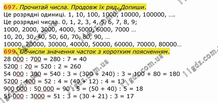 Прочитай числа. Продовж їх ряд. Допиши. Це розрядні одиниці. 1, 10, 100, 1000, 10000, 100000, …. Це розрядні числа. 0, 1, 2, 3, 4, 5, 6, 7, 8, 9; 1000, 2000, 3000, 4000, 5000, 6000, 7000 … 10, 20, 30, 40, 50, 60, 70, 80, 90, … 10000, 20000, 30000, 40000, 50000, 60000, 70000, 80000… 699. Обчисли значення часток з коротким поясненням. 28 000 : 700 = 280 : 7 = 40 5200 : 20 = 520 : 2 = 260 54 000 : 300 = 540 : 3 = (300 + 240) : 3 = 100 + 80 = 180 5200 : 400 = 52 : 4 = (40 + 12) : 4 = 13 900 000 : 50 000 = 90 : 5 = (50 + 40) : 5 = 18 51 000 : 3000 = 51 : 3 = (30 + 21) : 3 = 17