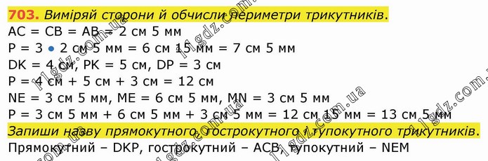 Виміряй сторони й обчисли периметри трикутників. АС = СВ = АВ = 2 см 5 мм Р = 3 ● 2 см 5 мм = 6 см 15 мм = 7 см 5 мм DK = 4 см, PK = 5 см, DP = 3 см Р = 4 см + 5 см + 3 см = 12 см NE = 3 см 5 мм, ME = 6 см 5 мм, MN = 3 см 5 мм Р = 3 см 5 мм + 6 см 5 мм + 3 см 5 мм = 12 см 15 мм = 13 см 5 мм Запиши назву прямокутного, гострокутного і тупокутного трикутників. Прямокутний – DKP, гострокутний – АСВ, тупокутний – NEM