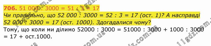 51 000 : 3000 = 51 : 3 = 17 Чи правильно, що 52 000 : 3000 = 52 : 3 = 17 (ост. 1)? А насправді 52 000 : 3000 = 17 (ост. 1000). Здогадалися чому? Тому, що коли ми ділимо 52000 : 3000 = 51000 : 3000 + 1000 : 3000 = 17 + ост.1000.