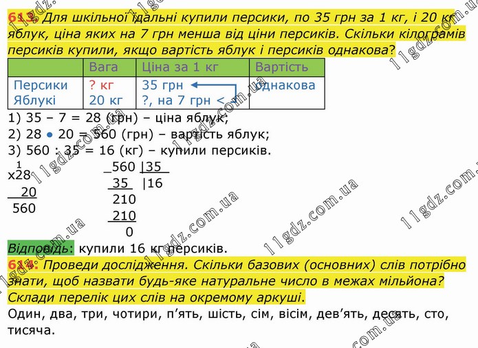 Для шкільної їдальні купили персики, по 35 грн за 1 кг, і 20 кг яблук, ціна яких на 7 грн менша від ціни персиків. Скільки кілограмів персиків купили, якщо вартість яблук і персиків однакова? Вага Ціна за 1 кг Вартість Персики Яблукі ? кг 20 кг 35 грн ?, на 7 грн < однакова 1) 35 – 7 = 28 (грн) – ціна яблук; 2) 28 ● 20 = 560 (грн) – вартість яблук; 3) 560 : 35 = 16 (кг) – купили персиків. Проведи дослідження. Скільки базових (основних) слів потрібно знати, щоб назвати будь-яке натуральне число в межах мільйона? Склади перелік цих слів на окремому аркуші. Один, два, три, чотири, п’ять, шість, сім, вісім, дев’ять, десять, сто, тисяча.