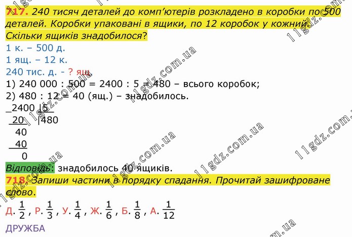 240 тисяч деталей до комп’ютерів розкладено в коробки по 500 деталей. Коробки упаковані в ящики, по 12 коробок у кожний. Скільки ящиків знадобилося? 1 к. – 500 д. 1 ящ. – 12 к. 240 тис. д. - ? ящ. 1) 240 000 : 500 = 2400 : 5 = 480 – всього коробок; 2) 480 : 12 = 40 (ящ.) – знадобилось. Запиши частини в порядку спадання. Прочитай зашифроване слово. Д. 12 , Р. 13 , У. 14 , Ж. 16 , Б. 18 , А. 112 ДРУЖБА