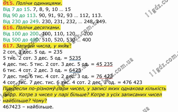 Полічи одиницями. Від 7 до 15. 7, 8, 9, 10 … 15 Від 90 до 113. 90, 91, 92, 93 … 112, 113. Від 230 до 249. 230, 231, 232, … 248, 249. 616. Полічи десятками. Від 100 до 200. 100, 110, 120, … 200 Від 500 до 400. 510, 520, 530 … 400 617. Запиши числа, у яких: 2 сот. 3 дес. 5 од. = 235 5 тис. 2 сот. 3 дес. 5 од. = 5235 4 дес. тис. 5 тис. 2 сот. 3 дес. 5 од. = 45 235 6 тис. 4 сот. 2 дес. 3 од. = 6423 7 дес. тис. 6 тис. 4 сот. 2 дес. 3 од. = 76 423 4 сот. тис. 7 дес. тис. 6 тис. 4 сот. 2 дес. 3 од. = 476 423 Підкресли по-різному пари чисел, у записі яких однакова кількість цифр. Котре з чисел у парі більше? Котре з усіх записаних чисел найбільше? Чому? 467423 – найбільше.