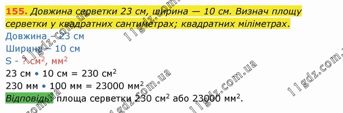 Довжина серветки 23 см, ширина — 10 см. Визнач площу серветки у квадратних сантиметрах; квадратних міліметрах. Довжина – 23 см Ширина – 10 см S - ? см2, мм2 23 см • 10 см = 230 см2 230 мм • 100 мм = 23000 мм2 Відповідь: площа серветки 230 см2 або 23000 мм2.