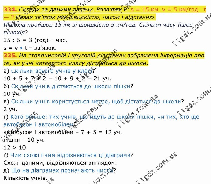 Склади за даними задачу. Розв’яжи її. s = 15 км v = 5 км/год t — ? Назви зв’язок між швидкістю, часом і відстанню. Пішохід пройшов 15 км зі швидкістю 5 км/год. Скільки часу йшов пішохід? 15 : 5 = 3 (год) – час. s = v • t – зв'язок. 335. На стовпчиковій і круговій діаграмах зображена інформація про те, як учні четвертого класу дістаються до школи. а) Скільки всього учнів у класі? 10 + 5 + 7 + 2 = 10 + 9 + 2 = 21 уч. б) Скільки учнів дістаються до школи пішки? 10 уч. в) Скільки учнів користується метро, щоб дістатися до школи? 2 уч. г) Кого більше: тих учнів, що йдуть до школи пішки, чи тих, хто їде автобусом і автомобілем? автобусом і автомобілем – 7 + 5 = 12 уч. пішки – 10 уч. 12 > 10 ґ) Чим схожі і чим відрізняються ці діаграми? Схожі даними, відрізняються виглядом. д) Що на діаграмах позначають числа? Кількість учнів.