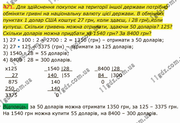 Для здійснення покупок на території іншої держави потрібно обміняти гривні на національну валюту цієї держави. В обмінних пунктах 1 долар США коштує 27 грн, коли здаєш, і 28 грн, коли купуєш. Скільки гривень можна отримати, здаючи 50 доларів? 125? Скільки доларів можна придбати за 1540 грн? За 8400 грн? 1) 27 • 100 : 2 = 2700 : 2 = 1350 (грн) – отримати з 50 доларів; 2) 27 • 125 = 3375 (грн) – отримати за 125 доларів; 3) 1540 : 28 = 55 доларів; 4) 8400 : 28 = 300 доларів. Відповідь: за 50 доларів можна отримати 1350 грн, за 125 – 3375 грн. На 1540 грн можна купити 55 доларів, на 8400 – 300 доларів.