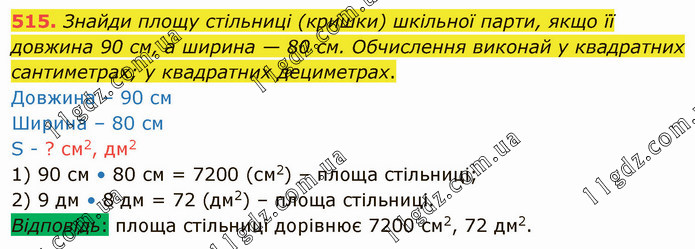Знайди площу стільниці (кришки) шкільної парти, якщо її довжина 90 см, а ширина — 80 см. Обчислення виконай у квадратних сантиметрах; у квадратних дециметрах. Довжина – 90 см Ширина – 80 см S - ? см2, дм2 1) 90 см • 80 см = 7200 (см2) – площа стільниці; 2) 9 дм • 8 дм = 72 (дм2) – площа стільниці. Відповідь: площа стільниці дорівнює 7200 см2, 72 дм2.