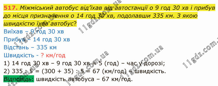 Міжміський автобус від’їхав від автостанції о 9 год 30 хв і прибув до місця призначення о 14 год 30 хв, подолавши 335 км. З якою швидкістю їхав автобус? Виїхав – 9 год 30 хв Прибув – 14 год 30 хв Відстань – 335 км Швидкість - ? км/год 1) 14 год 30 хв – 9 год 30 хв = 5 (год) – час у дорозі; 2) 335 : 5 = (300 + 35) : 5 = 67 (км/год) – швидкість. Відповідь: швидкість автобуса – 67 км/год.