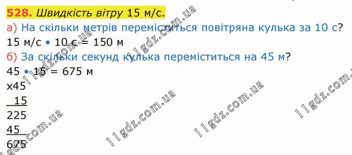 Швидкість вітру 15 м/с. а) На скільки метрів переміститься повітряна кулька за 10 с? 15 м/с • 10 с = 150 м б) За скільки секунд кулька переміститься на 45 м? 45 • 15 = 675 м