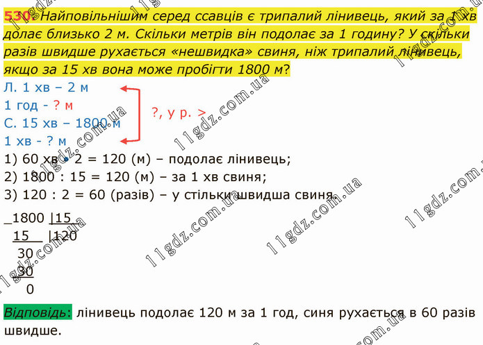 Найповільнішим серед ссавців є трипалий лінивець, який за 1 хв долає близько 2 м. Скільки метрів він подолає за 1 годину? У скільки разів швидше рухається «нешвидка» свиня, ніж трипалий лінивець, якщо за 15 хв вона може пробігти 1800 м? Л. 1 хв – 2 м 1 год - ? м С. 15 хв – 1800 м 1 хв - ? м 1) 60 хв • 2 = 120 (м) – подолає лінивець; 2) 1800 : 15 = 120 (м) – за 1 хв свиня; 3) 120 : 2 = 60 (разів) – у стільки швидша свиня. Відповідь: лінивець подолає 120 м за 1 год, синя рухається в 60 разів швидше.