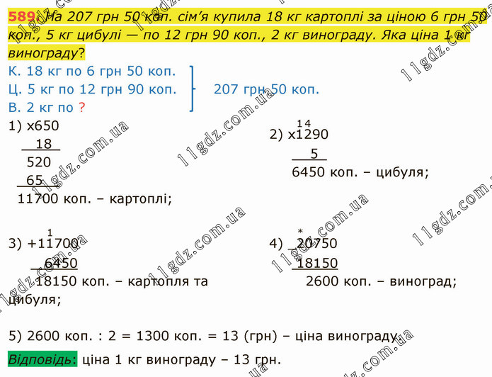 На 207 грн 50 коп. сім’я купила 18 кг картоплі за ціною 6 грн 50 коп., 5 кг цибулі — по 12 грн 90 коп., 2 кг винограду. Яка ціна 1 кг винограду? Відповідь: ціна 1 кг винограду – 13 грн.