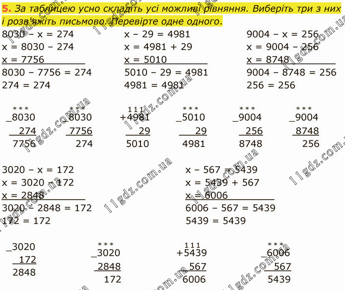 За таблицею усно складіть усі можливі рівняння. Виберіть три з них і розв'яжіть письмово. Перевірте одне одного. 8030 – х = 274 х = 8030 – 274 х = 7756_______ 8030 – 7756 = 274 274 = 274 х – 29 = 4981 х = 4981 + 29 х = 5010_______ 5010 – 29 = 4981 4981 = 4981 9004 – х = 256 х = 9004 – 256 х = 8748________ 9004 – 8748 = 256 256 = 256 3020 – х = 172 х = 3020 – 172 х = 2848_______ 3020 – 2848 = 172 172 = 172 х – 567 = 5439 х = 5439 + 567 х = 6006________ 6006 – 567 = 5439 5439 = 5439