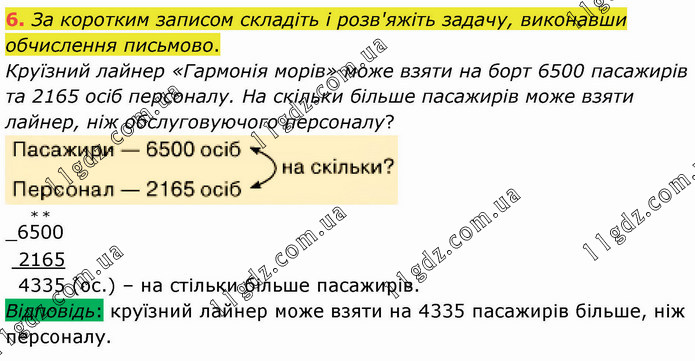 За коротким записом складіть і розв'яжіть задачу, виконавши обчислення письмово. Круїзний лайнер «Гармонія морів» може взяти на борт 6500 пасажирів та 2165 осіб персоналу. На скільки більше пасажирів може взяти лайнер, ніж обслуговуючого персоналу? _65(*)0(*)0 2165 4335 (ос.) – на стільки більше пасажирів. Відповідь: круїзний лайнер може взяти на 4335 пасажирів більше, ніж персоналу.