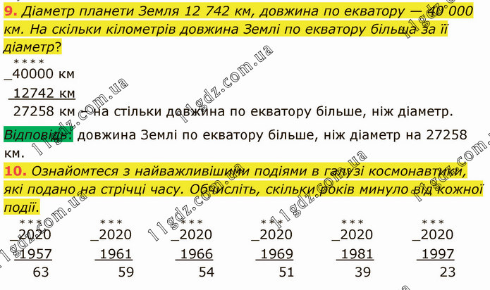 Діаметр планети Земля 12 742 км, довжина по екватору — 40 000 км. На скільки кілометрів довжина Землі по екватору більша за її діаметр? Ознайомтеся з найважливішими подіями в галузі космонавтики, які подано на стрічці часу. Обчисліть, скільки років минуло від кожної події.
